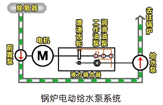 鍋爐電動給水泵系統(tǒng)由前置泵、電動機(jī)、液力耦合器、給水泵組成。系統(tǒng)根據(jù)機(jī)組負(fù)荷變化,通過液力耦合器調(diào)節(jié)給水泵供水量的大小,以滿足鍋爐生產(chǎn)系統(tǒng)供水需求。
