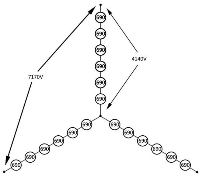 VFPS系列岸電電源系統(tǒng)采用功率單元串聯(lián)的形式,電壓疊加的原理類似于“電池組疊加”技術(shù)。當(dāng)需要6.6kV輸出時,每相串聯(lián)6個功率單元,每個功率單元輸出的交流有效值為634V,相電壓3810V,線電壓6600V。每個單元最高可以輸出690V,系統(tǒng)最高可以輸出7170V。