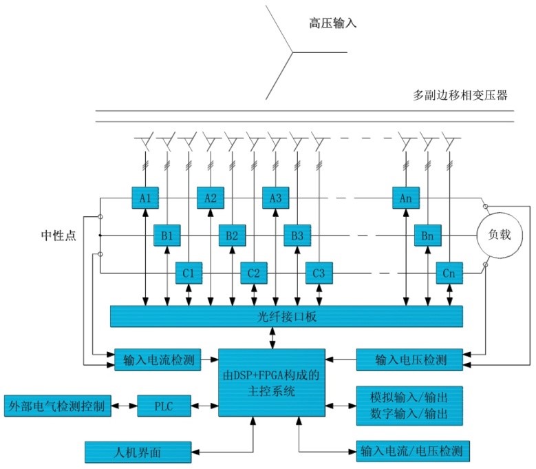 VFPS系列岸電電源系統(tǒng)由18個功率單元構(gòu)成,每6個單元串聯(lián)構(gòu)成一相,移相變壓器輸入側(cè)為36脈沖整流,輸出線電壓滿調(diào)制25電平,輸出側(cè)三相構(gòu)成Y型接法,直接給船用系統(tǒng)供電。