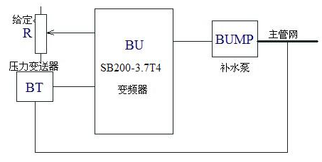為更進(jìn)一步的節(jié)能,對(duì)換熱站實(shí)施了自動(dòng)化改造,循環(huán)泵和補(bǔ)水泵用變頻調(diào)節(jié),整個(gè)城市供熱系統(tǒng)用計(jì)算機(jī)進(jìn)行監(jiān)控,實(shí)現(xiàn)了換熱站無(wú)人值守。通過循環(huán)泵使熱水在供熱系統(tǒng)中運(yùn)行,管道、閥門的泄漏引起循環(huán)水的水壓降低,如不及時(shí)補(bǔ)水,會(huì)造成供熱系統(tǒng)運(yùn)行不正常。補(bǔ)水泵的變頻泵補(bǔ)水方式比較簡(jiǎn)單,采用恒壓供水方式,設(shè)定壓力為4kg。本例選用一臺(tái)SB200-3.7T4變頻器,選用森納斯DG130W-BZ-A 1MPa壓力變送器,變頻調(diào)速補(bǔ)水系統(tǒng)如圖所示: