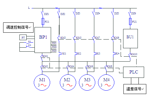 圖中,BP1—森蘭SB200-37T4變頻器,BU—軟啟動(dòng)器(自耦減壓起動(dòng)器),系統(tǒng)采用循環(huán)投切方式,溫差信號(hào)送入PLC,經(jīng)過PLC處理后,到變頻器作為調(diào)速控制信號(hào)。整個(gè)系統(tǒng)的運(yùn)行信息由PLC送到計(jì)算機(jī)上。