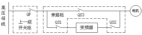 3、QS1、QS2閉合時,QS3斷開時,QF閉合時,電機由變頻器控制調(diào)速運行。QS1斷開、QS2斷開、QS3閉合時,電機可由QF直接啟停并進行保護,變頻器可完全和電網(wǎng)脫離,便于維護與檢修。