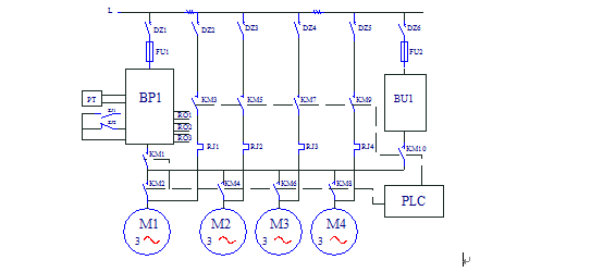 圖中:BP1—變頻器;BU2~BU4--軟起動(dòng)器,PT—壓力變送器。由圖一可見,變頻器連接在第一臺(tái)水泵電機(jī)上,需要加泵或減泵時(shí),由變頻器RO1~RO3端口輸出信號(hào)起動(dòng)或停止其他的水泵,這時(shí)水泵的起動(dòng)采用自耦降壓起動(dòng)裝置或軟起動(dòng)器。這種方案的特點(diǎn)是水泵電機(jī)不需要在變頻和工頻之間切換;第一臺(tái)水泵永遠(yuǎn)連接在變頻器上,沒有切換過程中的失壓現(xiàn)象;由于變頻泵以外的泵都有軟起動(dòng)器,所以不需要再做備用系統(tǒng),當(dāng)變頻器故障時(shí),可用軟起動(dòng)器手動(dòng)起動(dòng)M2~M4水泵,保證供水不致中斷;每臺(tái)電機(jī)都有起動(dòng)器,初始投資較大。另一種是“循環(huán)投切”方案,系統(tǒng)圖如圖二所示