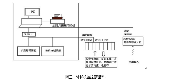 為保證系統(tǒng)的可靠性,上位機(jī)PC用于管理,用組態(tài)軟件做出若干工藝流程圖,實(shí)時(shí)顯示系統(tǒng)的運(yùn)行狀況,并統(tǒng)計(jì)歷史數(shù)據(jù),如需要可隨時(shí)打印報(bào)表;還用于故障的報(bào)警和處理。PC機(jī)為研華工業(yè)計(jì)算機(jī),PLC為西門子S-7300,便于與總控室計(jì)算機(jī)聯(lián)網(wǎng),采用帶有PROFIBUS接口的CPU315。CP5611是通信模塊,PDM-820AC電參數(shù)綜合分析儀用于檢測(cè)系統(tǒng)的用電量??刂扑玫钠?停,切換,閥的啟/閉;電機(jī)電流,溫度的檢測(cè),水泵使用時(shí)間的統(tǒng)計(jì);壓力,流量,水質(zhì)參數(shù)的采集等,均由PLC完成。水壓的給定值由變頻器鍵盤設(shè)定。