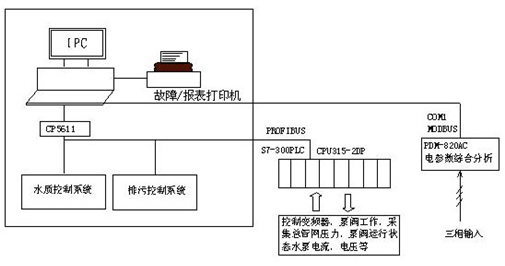 為保證系統(tǒng)的可靠性,上位機(jī)PC用于管理,用組態(tài)軟件做出若干工藝流程圖,實(shí)時(shí)顯示系統(tǒng)的運(yùn)行狀況,并統(tǒng)計(jì)歷史數(shù)據(jù),如需要可隨時(shí)打印報(bào)表;還用于故障的報(bào)警和處理。PC機(jī)為研華工業(yè)計(jì)算機(jī),PLC為西門子S-7300,便于與總控室計(jì)算機(jī)聯(lián)網(wǎng),采用帶有PROFIBUS接口的CPU315。CP5611是通信模塊,PDM-820AC電參數(shù)綜合分析儀用于檢測系統(tǒng)的用電量??刂扑玫钠?停,切換,閥的啟/閉;電機(jī)電流,溫度的檢測,水泵使用時(shí)間的統(tǒng)計(jì);壓力,流量,水質(zhì)參數(shù)的采集等,均由PLC完成。水壓的給定值由變頻器鍵盤設(shè)定。