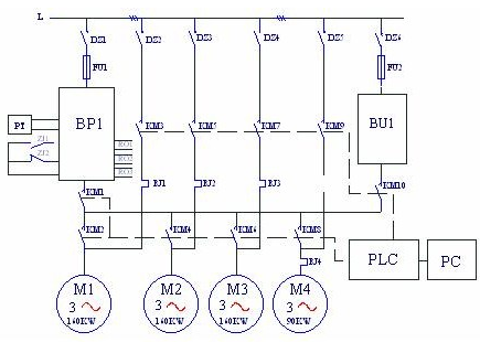 圖中:BP1—變頻器;BU2~BU4--軟起動(dòng)器,PT—壓力變送器。由圖一可見,變頻器連接在第一臺(tái)水泵電機(jī)上,需要加泵或減泵時(shí),由變頻器RO1~RO3端口輸出信號(hào)起動(dòng)或停止其他的水泵,這時(shí)水泵的起動(dòng)采用自耦降壓起動(dòng)裝置或軟起動(dòng)器。這種方案的特點(diǎn)是水泵電機(jī)不需要在變頻和工頻之間切換;第一臺(tái)水泵永遠(yuǎn)連接在變頻器上,沒有切換過程中的失壓現(xiàn)象;由于變頻泵以外的泵都有軟起動(dòng)器,所以不需要再做備用系統(tǒng),當(dāng)變頻器故障時(shí),可用軟起動(dòng)器手動(dòng)起動(dòng)M2~M4水泵,保證供水不致中斷;每臺(tái)電機(jī)都有起動(dòng)器,初始投資較大。另一種是“循環(huán)投切”方案,系統(tǒng)圖如圖二所示