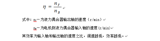 液力偶合器是通過(guò)控制工作腔內(nèi)工作油液的動(dòng)量矩變化,來(lái)傳遞電動(dòng)機(jī)能量,電動(dòng)機(jī)通過(guò)液力偶合器的輸入軸拖動(dòng)其主動(dòng)工作輪,對(duì)工作油進(jìn)行加速,被加速的工作油再帶動(dòng)液力偶合器的從動(dòng)工作渦輪,把能量傳遞到輸出軸和負(fù)載。液力偶合器有調(diào)速型和限矩型之分,前者用于電氣傳動(dòng)的調(diào)速,后者用于電機(jī)的起動(dòng)。調(diào)速型液力偶合器效率最大值為95%。液力偶合器的效率計(jì)算的公式為: